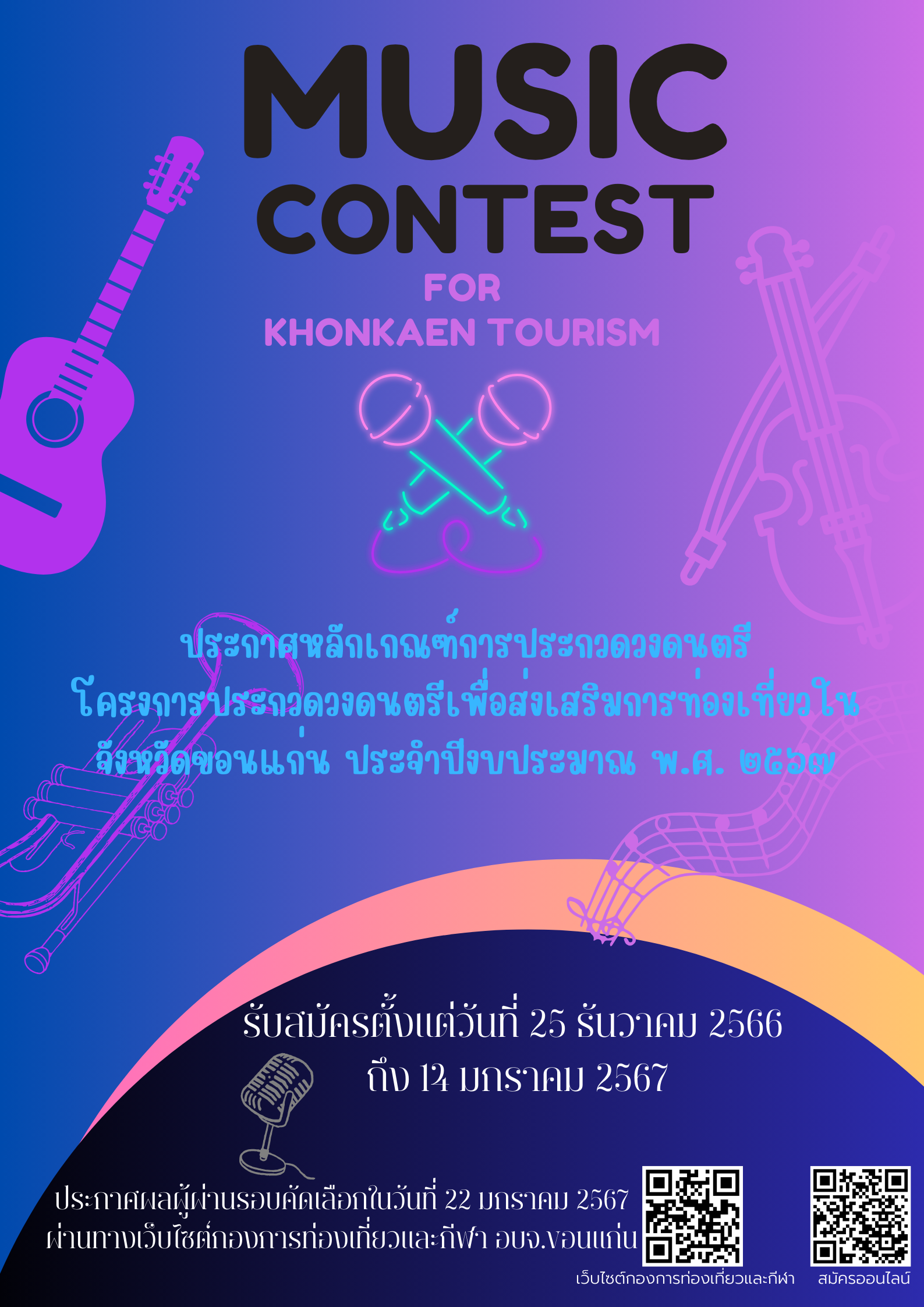 จำนวนผู้ชม: 219 *****ประกาศหลักเกณฑ์ประกวดวงดนตรี***** “โครงการประกวดวงดนตรีเพื่อส่งเสริมการท่องเที่ยวในจังหวัดขอนแก่น ประจำปีงบประมาณ 2567” รับสมัครตั้งแต่วันที่ 25 ธันวาคม 2566 ถึงวันที่ 14 มกราคม 2567 ประกาศผลผู้ผ่านรอบคัดเลือกในวันที่ 22 มกราคม 2567 ผ่านทางเว็บไซต์กองการท่องเที่ยวและกีฬา อบจ.ขอนแก่น รายละเอียดเพิ่มเติมตามลิ้งค์แนบ ประกาศหลักเกณฑ์การคัดเลือกการแข่งขัน โครงการประกวดวงดนตรีเพื่อส่งเสริมการท่องเที่ยวในจังหวัดขอนแก่น ประจำปีงบประมาณ พ.ศ. 2567 (google.com) รายละเอียดแหล่งท่องเที่ยว ดาวน์โหลด Khon Kaen Geopark (khonkaen-geopark.com) Post navigation ประชาสัมพันธ์ เชิญชวนศึกษาดูงานและแลกเปลี่ยนเรียนรู้เพื่อพัฒนาท้องถิ่น