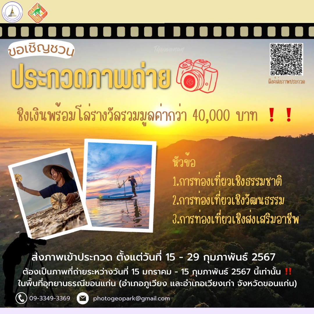 เชิญชวนทุกท่านที่สนใจ ส่งภาพเข้าประกวดในโครงการพัฒนาสื่อศิลปะภาพถ่ายเพื่อประชาสัมพันธ์และส่งเสริมการท่องเที่ยวอุทยานธรณีขอนแก่น ประจำปีงบประมาณ 2567 กิจกรรม : การประกวดภาพถ่ายอุทยานธรณีขอนแก่น เริ่มส่งภาพได้ตั้งแต่ วันที่ 15 – 29 กุมภาพันธ์ 2567 ภาพที่ส่งเข้าประกวดต้องเป็นภาพถ่ายที่ถ่ายด้วยตนเอง ห้ามคัดลอก หรือกระทำการใดๆ อันเป็นการละเมิดลิขสิทธิ์ของผู้อื่น และต้องเป็นภาพที่ถ่ายภายในวันที่ 15 มกราคม – 15 กุมภาพันธ์ 2567 นี้เท่านั้น เป็นภาพที่ถ่ายในเขตอุทยานธรณีขอนแก่น (อำเภอภูเวียง และอำเภอเวียงเก่า จังหวัดขอนแก่น) ภายใต้หัวข้อดังนี้ 1. การท่องเที่ยวเชิงธรรมชาติ