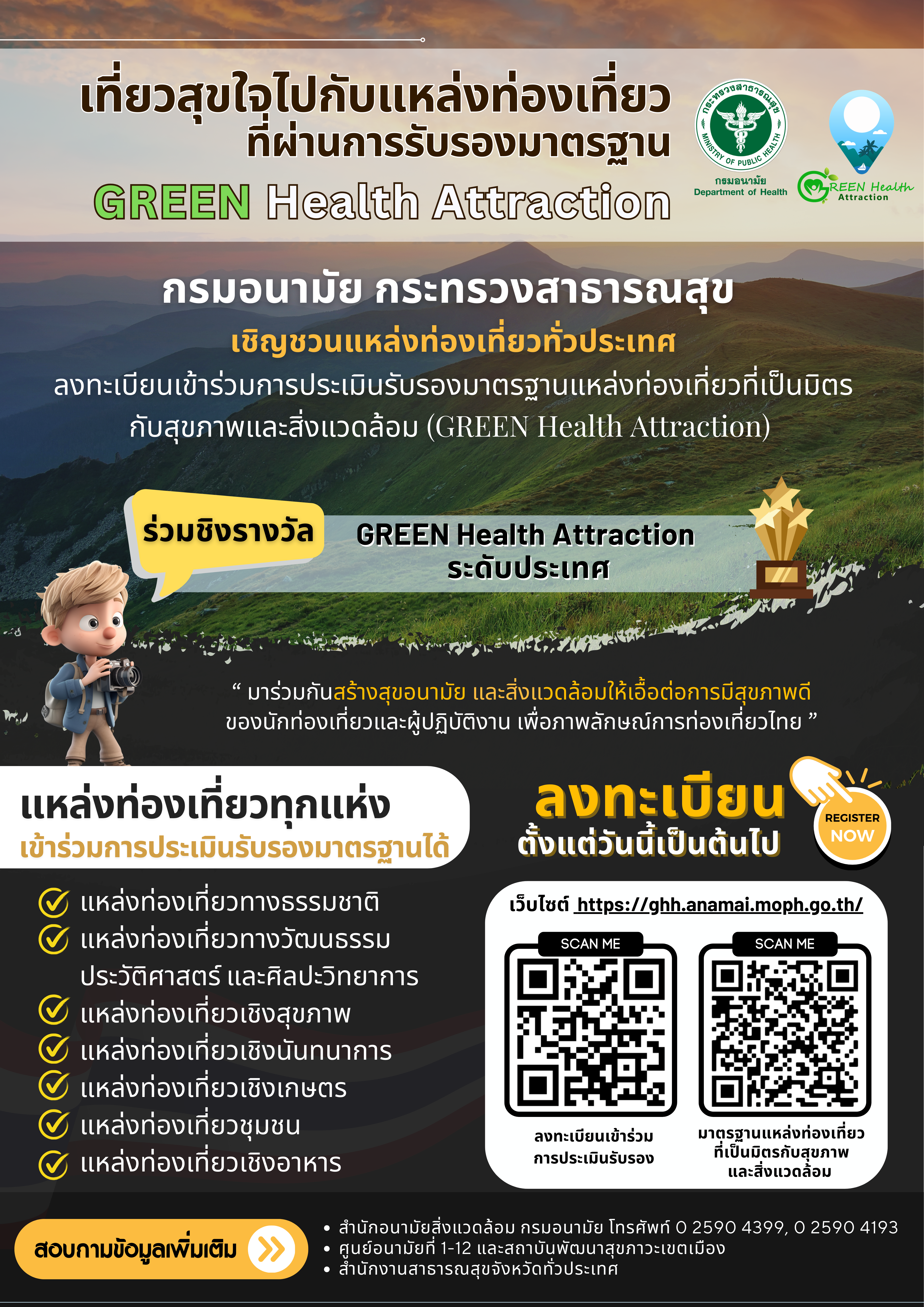 การจัดการอนามัยสิ่งแวดล้อม และการส่งเสริมสุขภาพของโรงแรมและแหล่งท่องเที่ยวให้มีคุณภาพได้มาตรฐาน ตามหลักวิชาการ และเป็นไปตามกฏหมายว่าด้วยการสาธารณสุข และกฏหมายอื่น ที่เกี่ยวข้องโดยเมื่อผ่านการประเมินจะได้รับประกาศนียบัตรรับรองและประชาสัมพันธ์ผ่านสื่อๆต่างๆของกรมอนามัย รวมทั้งได้รับสิทธิในการเข้ารับรางวัล GREEN Health Hotel Quality Award 2025 และ GREEN Health Attraction
