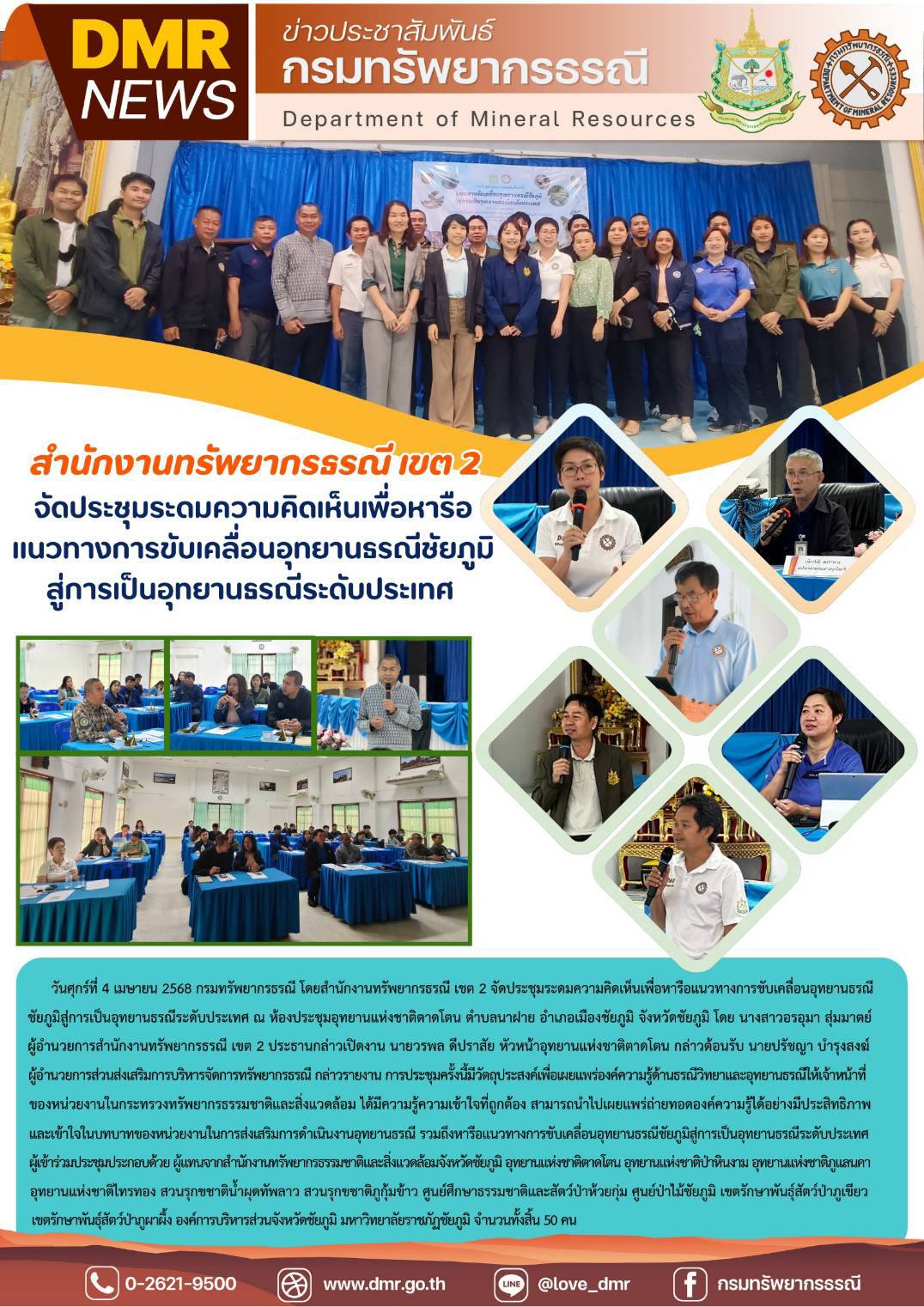 วันที่ 4 เมษายน 2568 นายสุธรรม วงษ์จันทร์ หัวหน้าอุทยานแห่งชาติภูเวียง ในฐานะรองผู้อำนวยการอุทยานธรณีขอนแก่น พร้อมด้วย น.ส.ผกาสวรรค์ ปรัชญคุปต์ ผู้จัดการอุทยานธรณีขอนแก่น ได้รับเชิญจากกรมทรัพยากรธรณี ไปเป็นวิทยากรในการประชุมระดมความคิดเห็นในการขับเคลื่อนอุทยานธรณีชัยภูมิสู่อุทยานธรณีระดับประเทศ